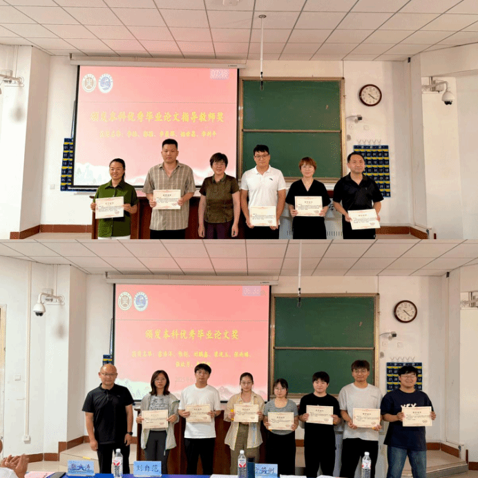 经过答辩委员会的共同商议,物电学院执行院长方莉俐为指导教师李林,郭颖,李晨辉,姚世昌和李利平颁发“2025届本科优秀毕业论文指导教师”证书;副院长郭鹏为雷浩洋,陈钊,刘鹏鑫,梁现玉,张雨璐,张欣月和秦明智颁发“2025届本科优秀毕业论文”证书,并合影留念。