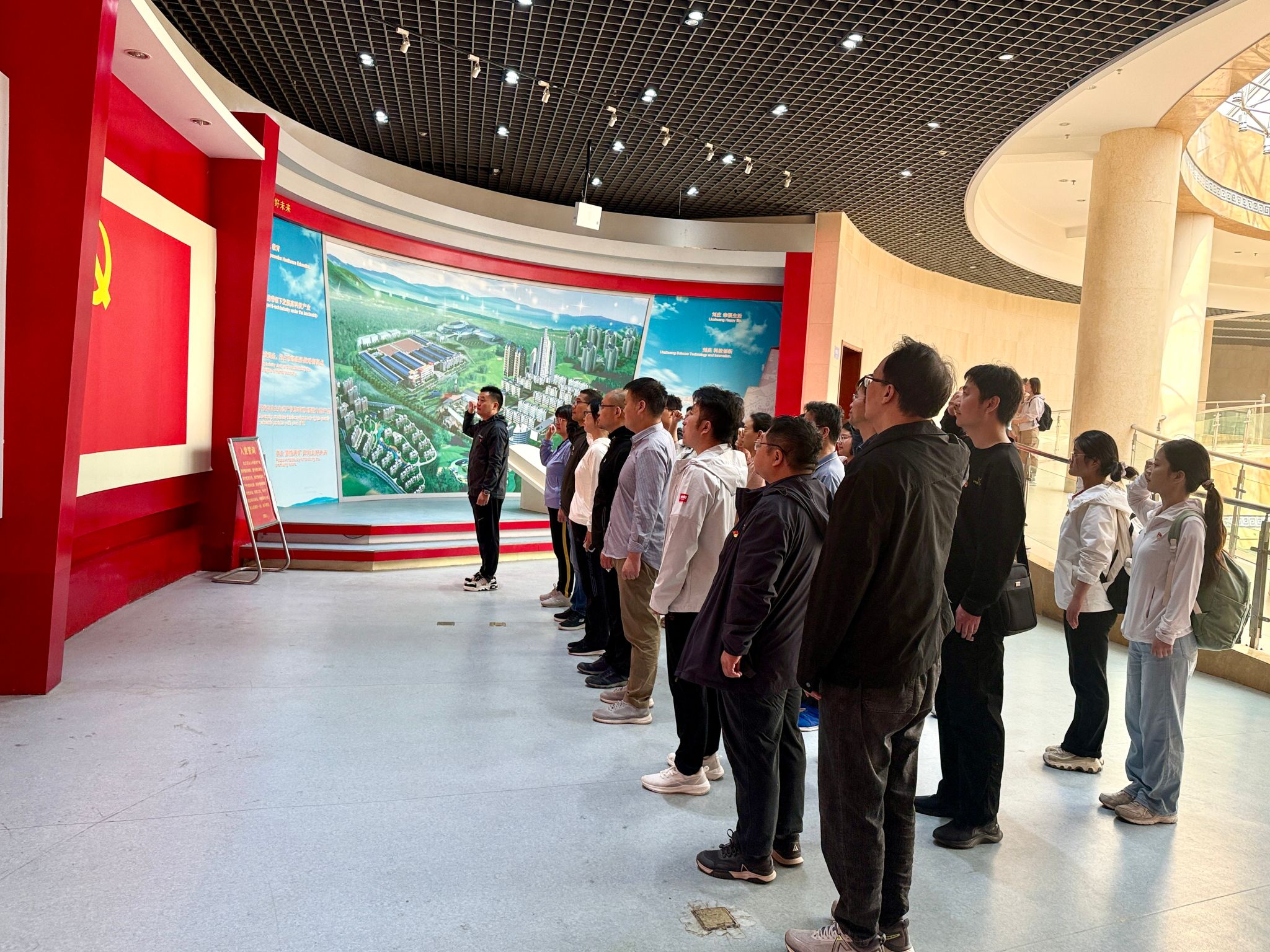 参观结束,面对鲜红的党旗,全体党员举行了庄严的宣誓仪式,党员们右手握拳,在党总支书记张海斌带领下,重温入党誓词。每一位党员都神情严肃,目光坚定,用誓言表达着传承红色基因、践行使命担当的决心。