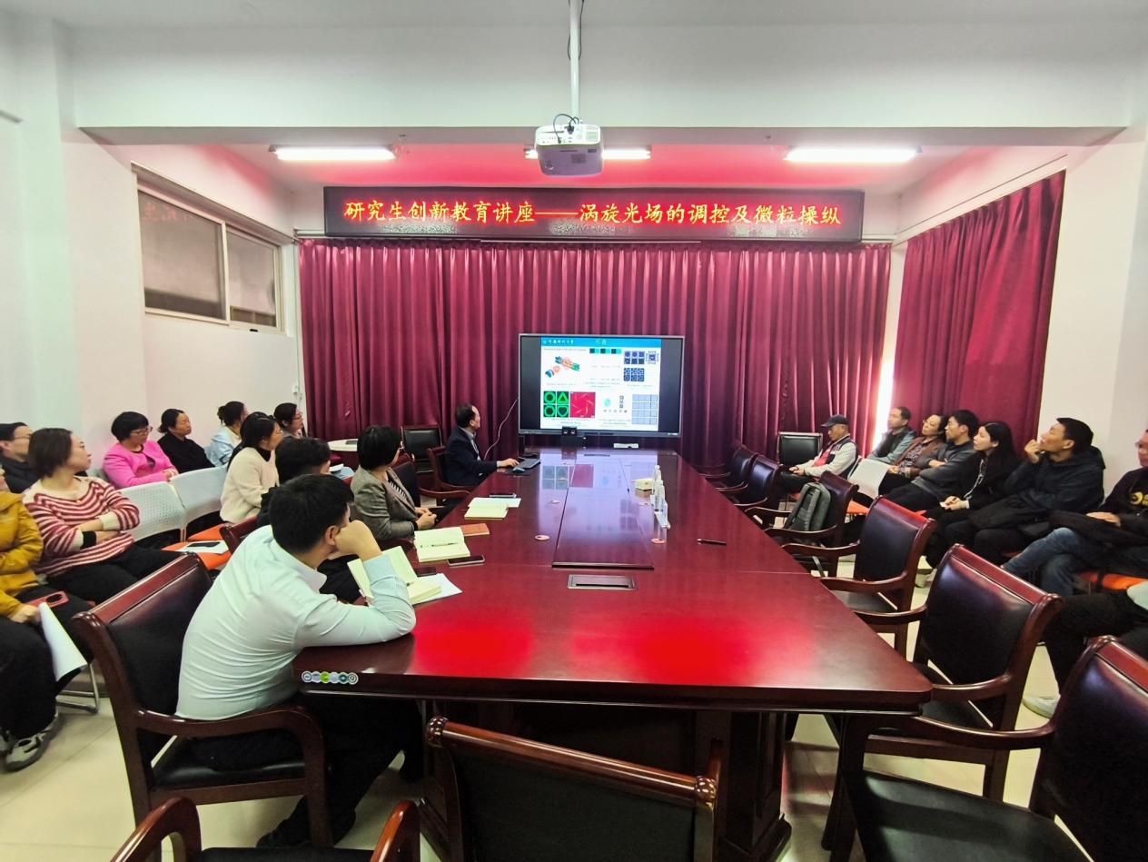 结构光场具有更高的调控维度,因此受到研究人员越来越多的关注,在超分辨率成像大容量通信,超精确光阱或光镊等领域具有重要的应用价值。具有多个光学涡旋的涡旋阵列光场具有更高的调控自由度和重要的研究价值。李新忠从结构光场的应用出发提出了一种摆线结构光学涡旋阵列并构成了一种光学齿轮。通过结合本轮模型,产生了一种不依赖数学表达式的任意结构的光学涡旋阵列光场。通过对多个拉盖尔-高斯涡旋光束的部分空间叠加,将源场的相位周期作为额外相位,提出了一种离散高阶光学涡旋阵列,提高了调制深度。光学操纵目标时的自由度越大,获得的机动次数越多,机动精度越高,这在生物学及相关的显微检测中具有重要意义。会后,李新忠与现场研究生进行了深入研讨交流,他结合自己的科研经历,讲述了科研兴趣的重要性,鼓励同学们勇于突破传统思维,敢于尝试新的领域和方法。