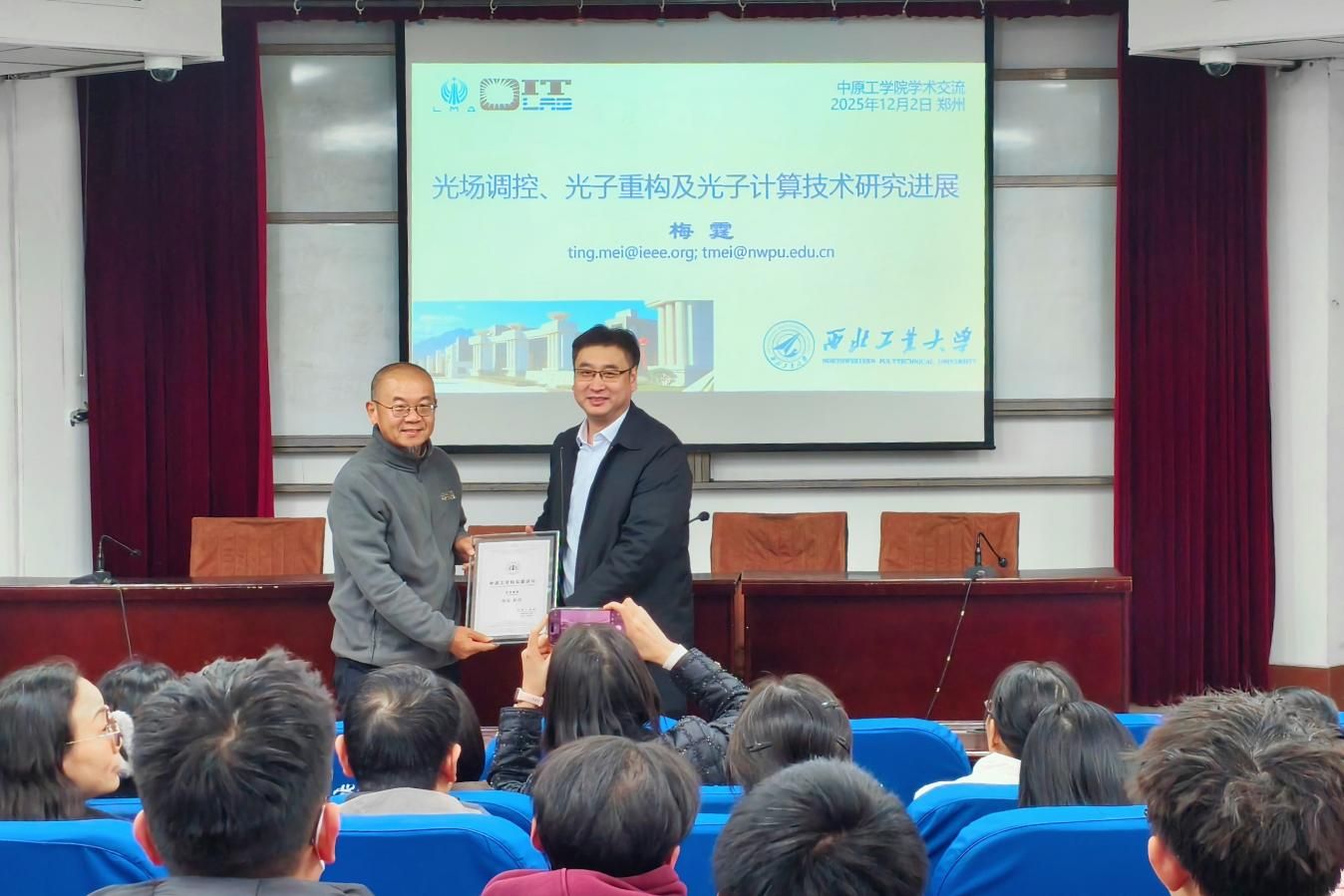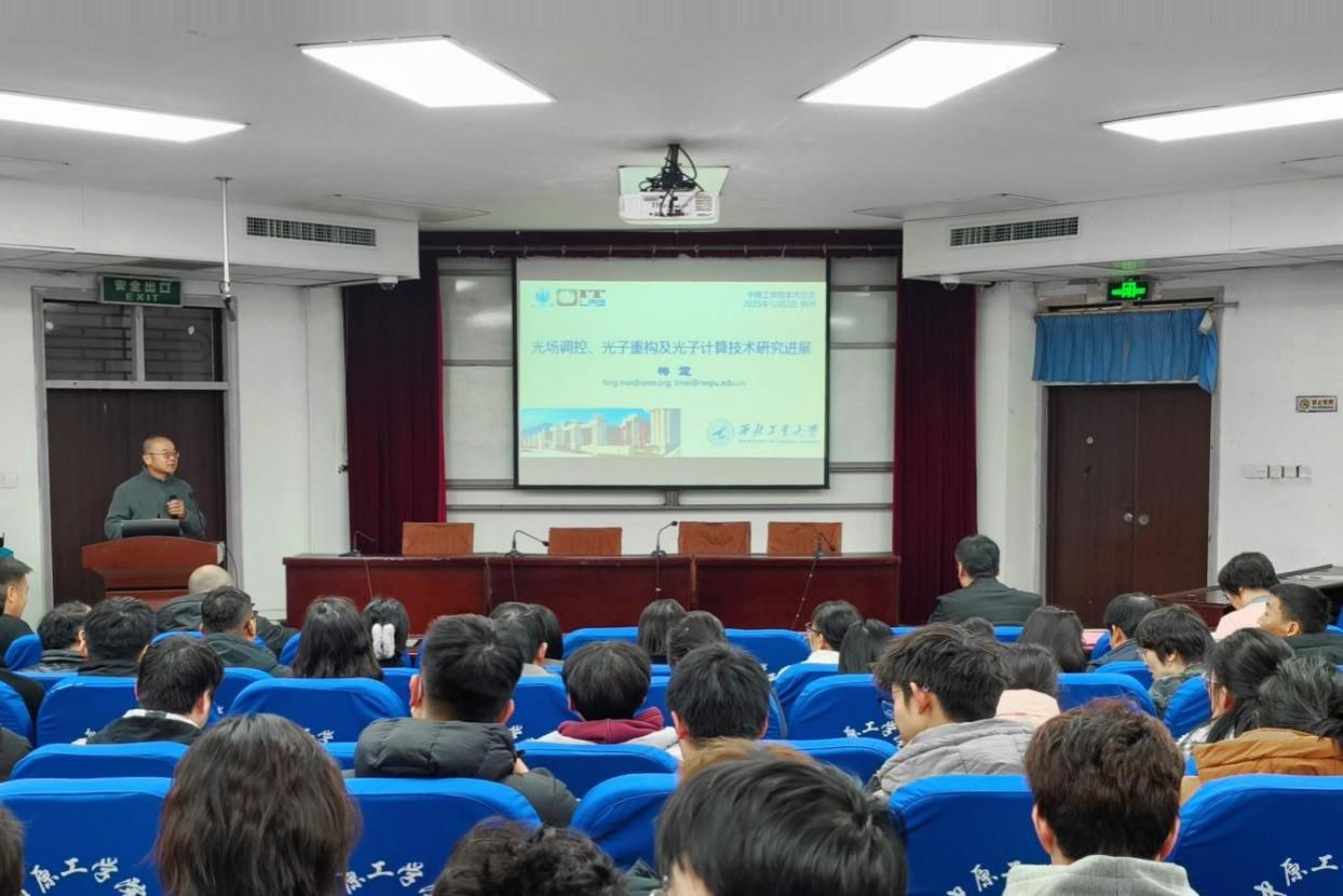 会上,梅霆聚焦光场调控与光子重构等前沿方向,系统介绍其团队在光场调控与增强光谱术、光子重构以及光子多突触神经网络等领域的最新研究进展。整场报告内容翔实,梅霆教授深厚的学术素养和对前沿技术的敏锐洞察给在场师生留下深刻印象。